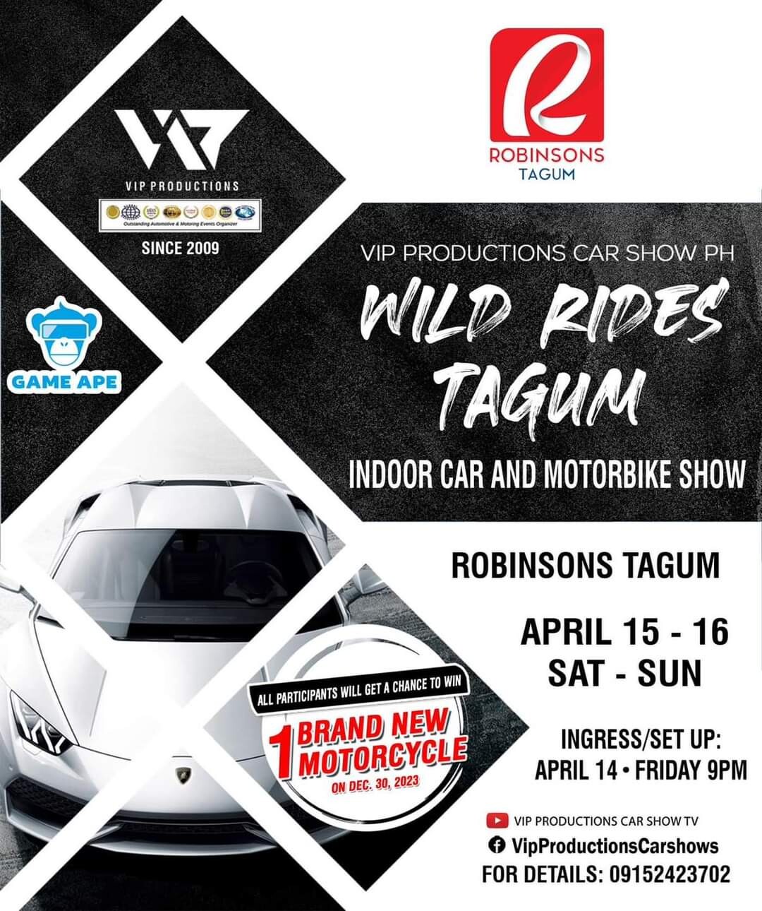 ‼️Our Mindanao Series is back! This time, we go indoor airconditioned inside the mall. The long wait is over!! Get ready for WILD RIDES TAGUM 2023 NATIONAL SHOW SERIES!‼️ ✅ All VIP Productions’ Wild Rides Participants will get a chance to win 1 brand new motorbike in the raffle.🏍️ 🏆Imported trophies to be given away. 🗓️ April 15-16 (‼️Ingress Friday night, mall closing) 📍Robinsons Tagum ❗️Walk in entries to all, no reservations needed. 📌All rides are welcome to join! VIP Productions National Standard. Open category system, we will judge according to your ride. From the basic street level to the wildest rides! ❇️With surprises from GameApe, Asian Lifestyle Thai Slides and more! 👀 FREE for VIEWERS, NO GATE FEE. 💯