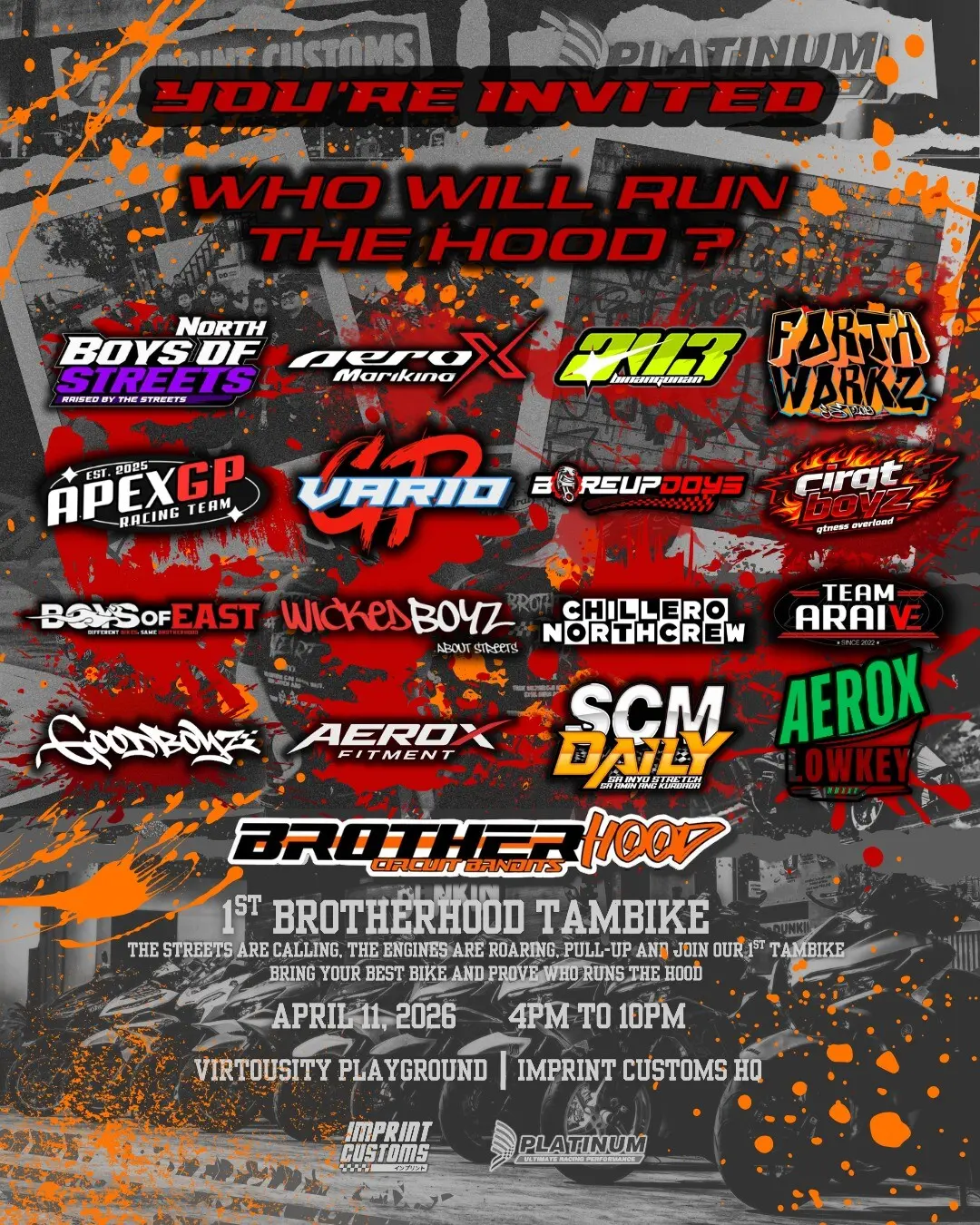 More are joining the HoodNation! Don't get left behind. Represent your hood. April 11 2026 (Saturday) 📍Virtuosity Playground | Imprint Customs HQ #brotherhoodtambike #ImprintCustoms #platinumlubricants
