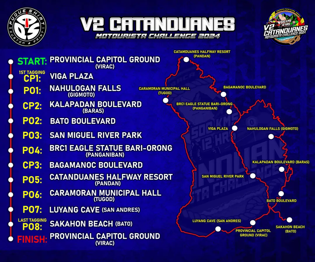 Catanduanes moTOURista Challenge 2024 500KM 12HOURS ABACA FESTIVAL 2024 CMC v.2 ROUTE MAP START- PROVINCIAL CAPITOL GROUND(VIRAC) 13.586139,124.237003 1st TAGGING: CHECK POINT 1- VIGA PLAZA 13.871393,124.308676 PHOTO OPS 1- NAHULUGAN FALLS(GIGMOTO) 13.786407,124.372064 CHECK POINT 2-KALAPADAN BOULEVARD(BARAS) 13.658576,124.371487 PHOTO OPS 2-BATO BOULEVARD 13.609586,124.296828 PHOTO OPS 3- SAN MIGUEL RIVER PARK 13.706180,124.281006 PHOTO OPS 4-BRC1 EAGLE STATUE BARI-ORONG(PANGANIBAN) 13.896685,124.291332 CHECK POINT 3- BAGAMANOC BOULEVARD 13.941481,124.288608 PHOTO OPS 5- CATANDUANES HALFWAY RESORT(PANDAN) 14.067582,124.226505 PHOTO OPS 6- CARAMORAN MUNICIPAL HALL (TUGOD) 13.983975,124.132911 PHOTO OPS 7- LUYANG CAVE(SAN ANDRES) 13.605142,124.135027 LAST TAGGING: PHOTO OPS 8- SAKAHON BEACH(BATO) 13.557817,124.319069 FINISH- PROVINCIAL CAPITOL GROUND(VIRAC) For online registration: Click 👇 https://docs.google.com/.../1FAIpQLScmyBb7v8fMTh.../viewform For Walk-in participants: Visit as at: Precision TECH Motoshop Gogon Virac CATANDUANES And look for Ms.Railene Fuentebella GCASH:09985413401 E....N T. LET'S ENJOY THE ISLAND LET'S RIDE TOGETHER SEE YOU ALL SA GRID